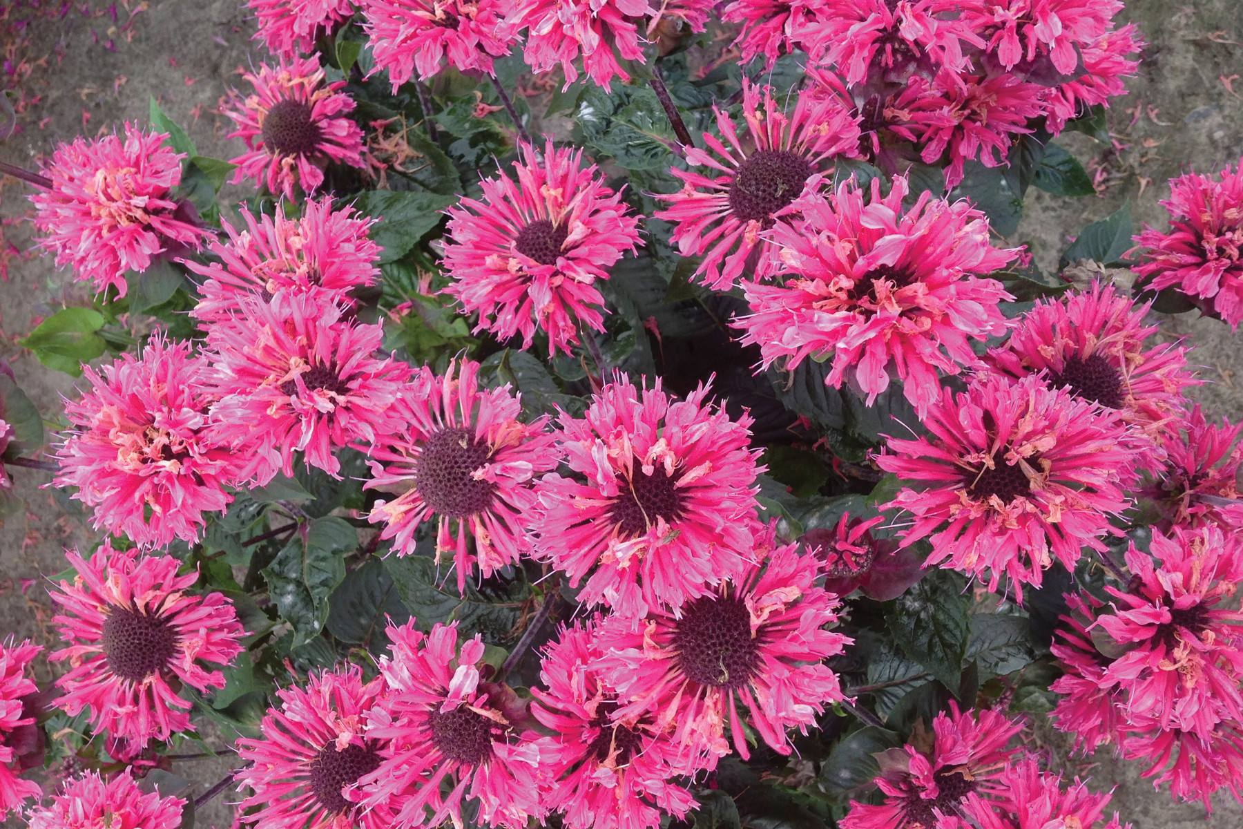 A rich shade of magenta surrounds a brown button center in this excellent dwarf Monarda. Rich green ..