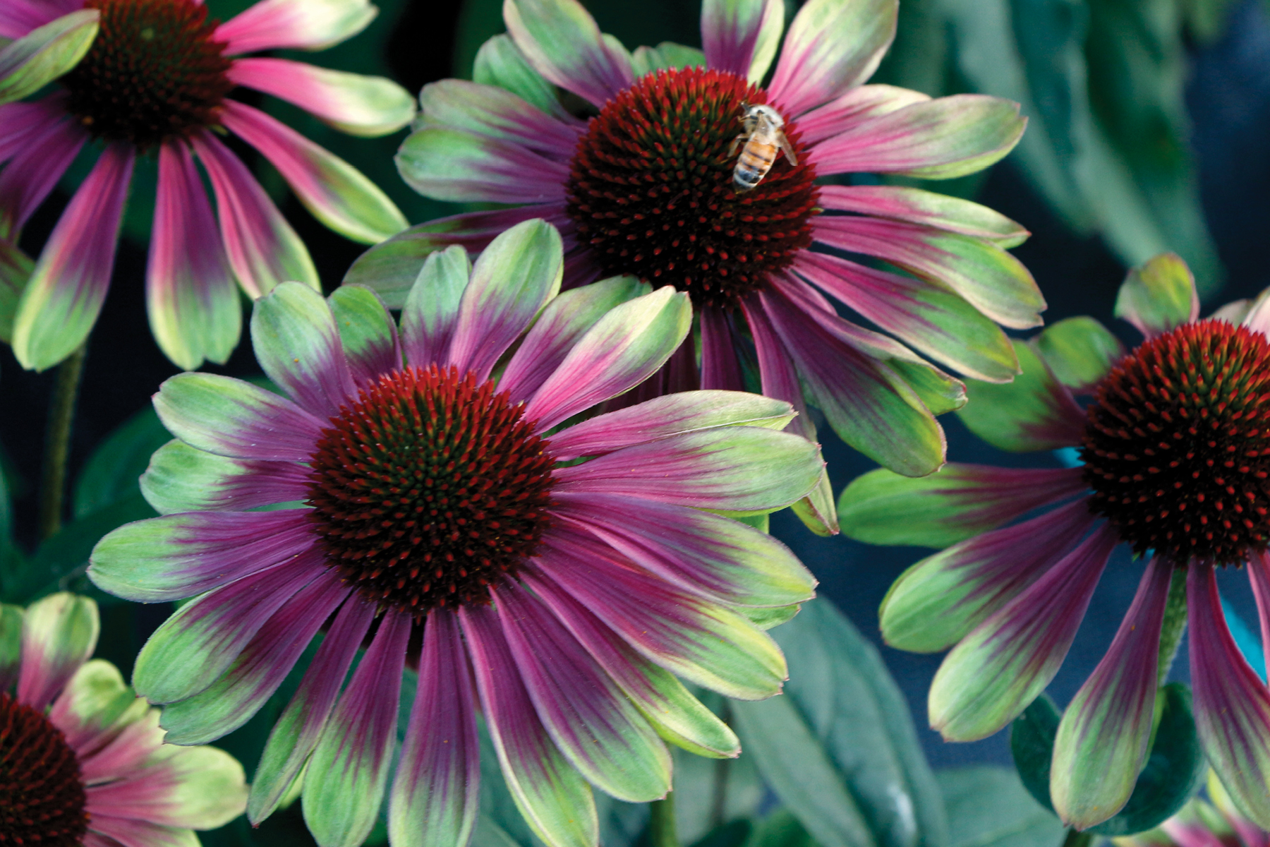 Distinctive bands of pink and green run radially around the flower. It has the modern breeding we expect from the Renaissance generation of Echinacea. Sandia is the Spanish name for watermelon.