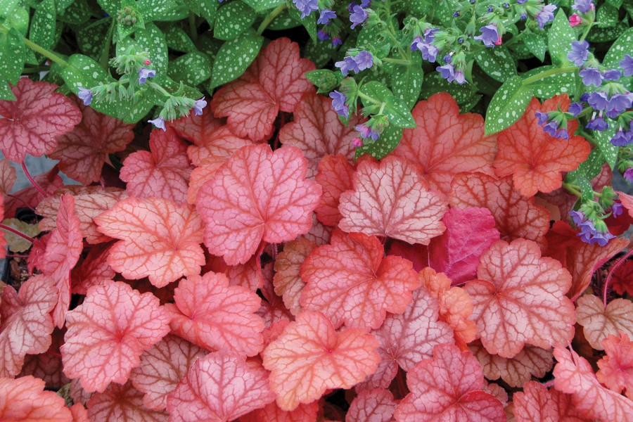Large bold leaves change colors throughout the growing season. In early spring they emerge peach-orange with darker veins, and acquire rose tones as they mature in summer. Lush color intensifies in fall and winter to a frosted, rosy purple. Foliage in all seasons has a silver-white overlay. Heat and humidity-tolerant.
